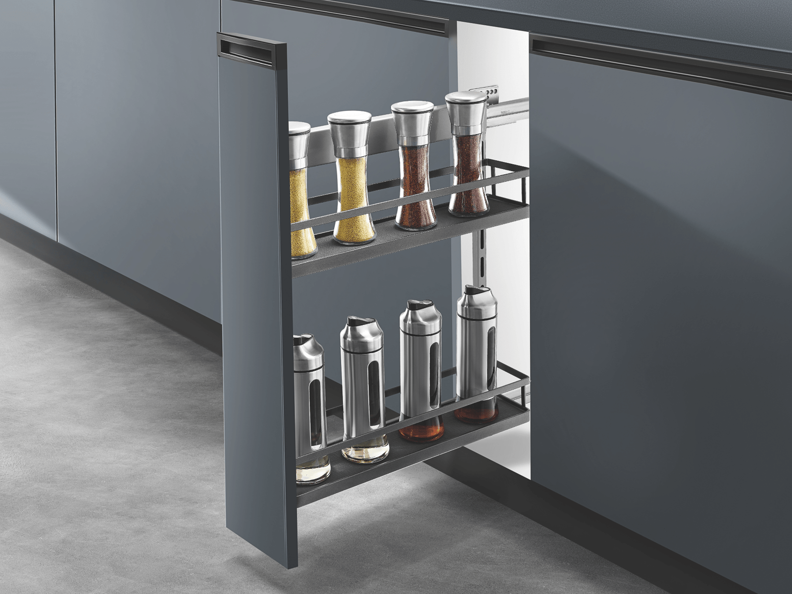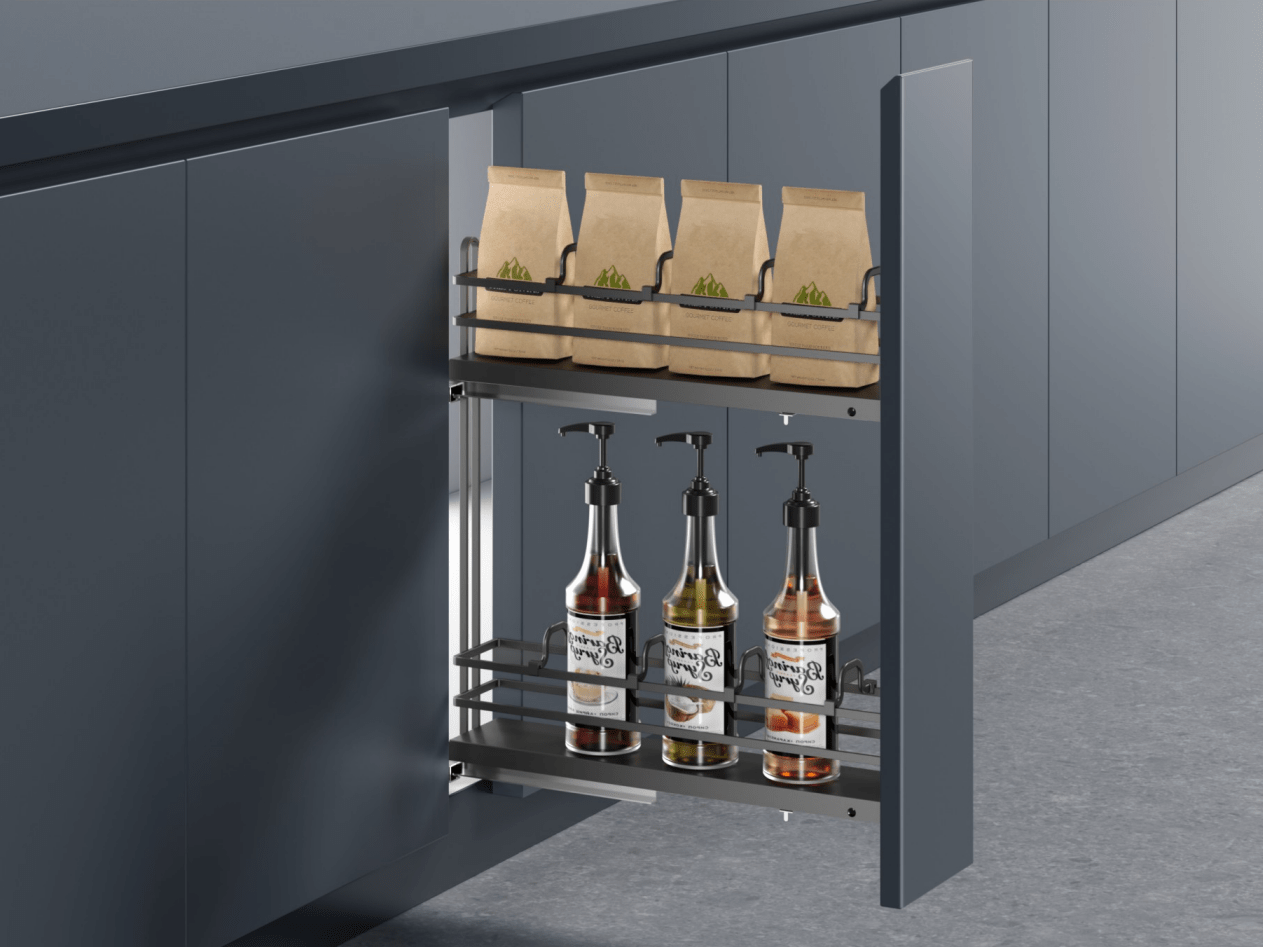 Carlton Series Seasoning Basket – Sleek pull-out storage for spices and condiments, available in 300–450 mm sizes with smooth sliding and modern metallic finishes.