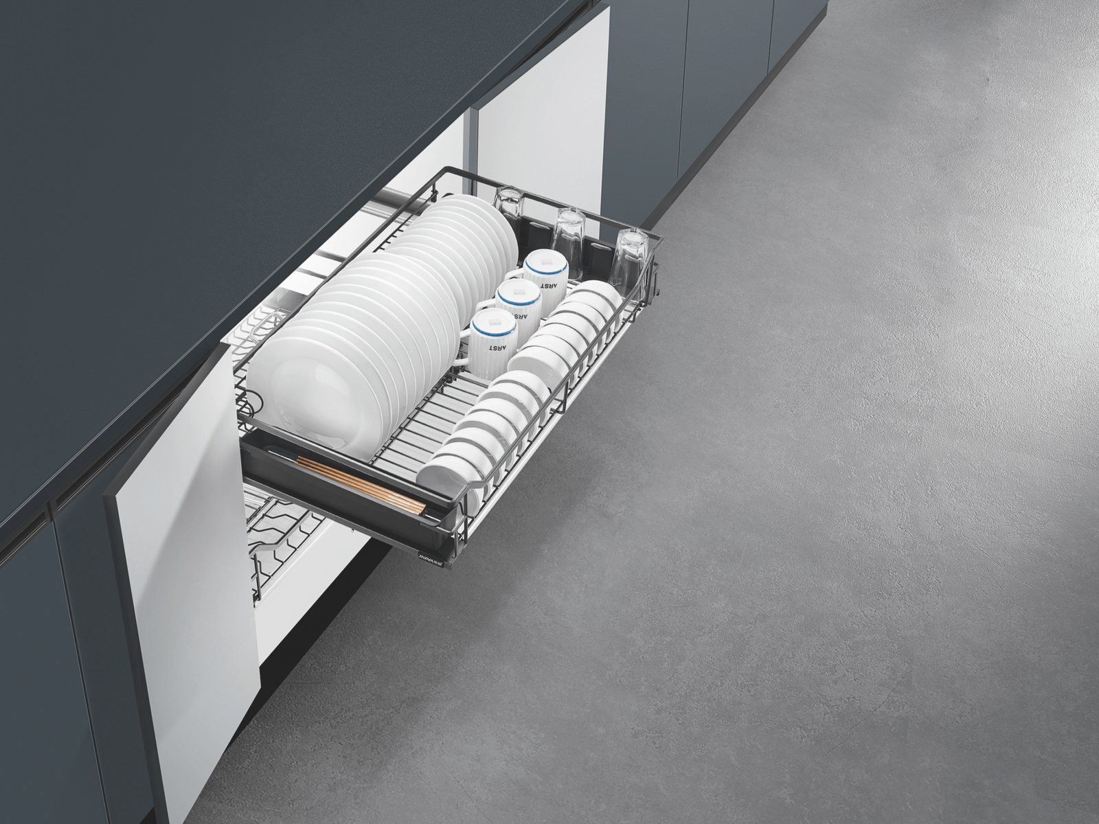 Carlton Series Hearth Three-sided Dish Basket – Stylish steel gray pull-out basket for 600–900 mm cabinets, designed for smooth sliding and organized dish storage.