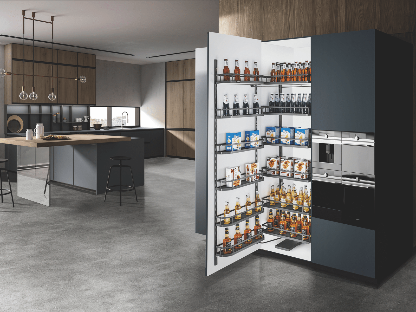 Carlton Series Large Magic Corner – Space-saving corner pull-out storage in 450 mm & 600 mm sizes with 2–6 layers. Smooth sliding, durable design, and modern gray finishes for efficient kitchen organization.
