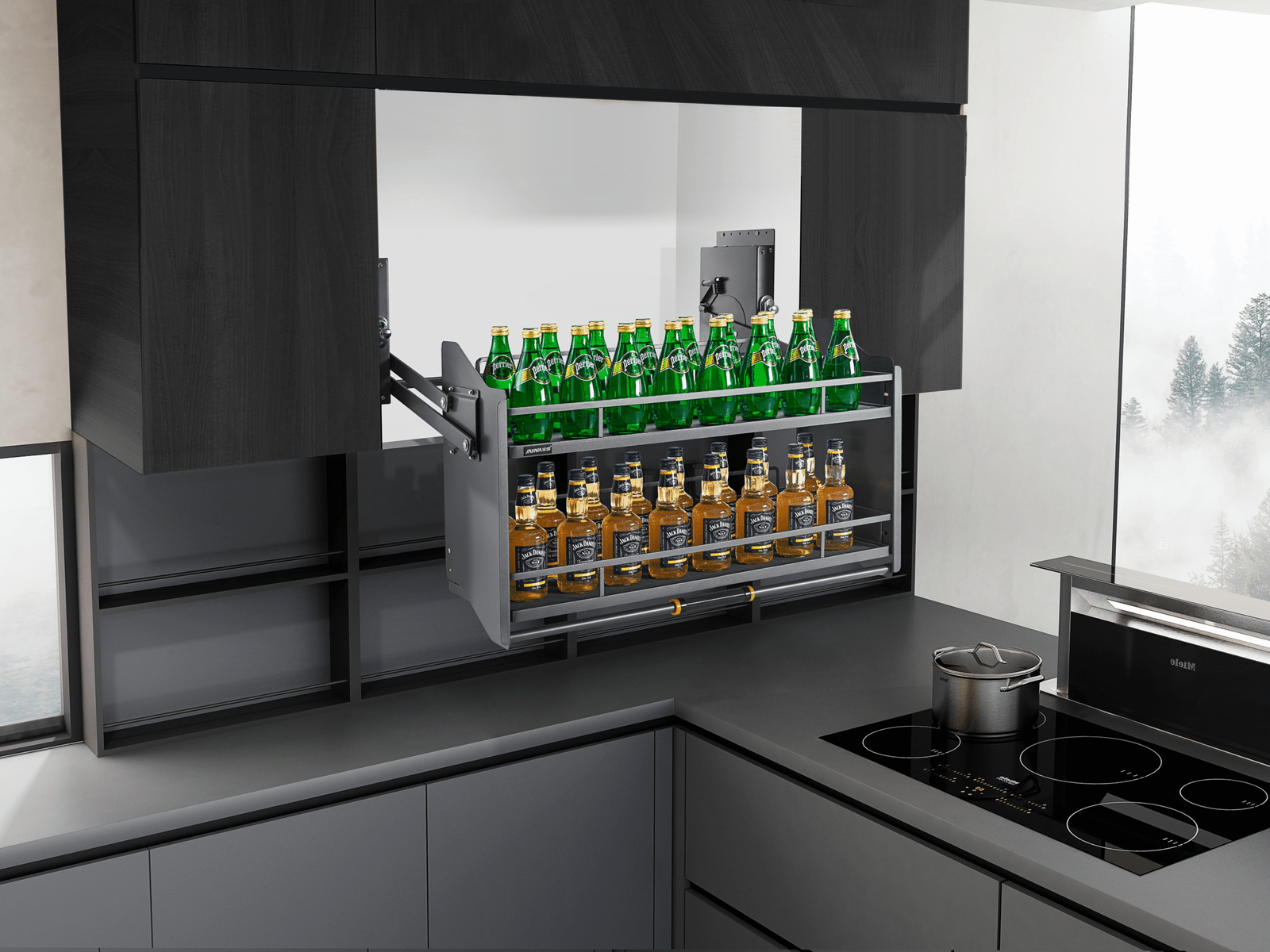 Carlton Series Lifter Storage Basket – Pull-down basket system for 600–900 mm cabinets, offering smooth lifting, stylish finishes, and smart organization for overhead storage.