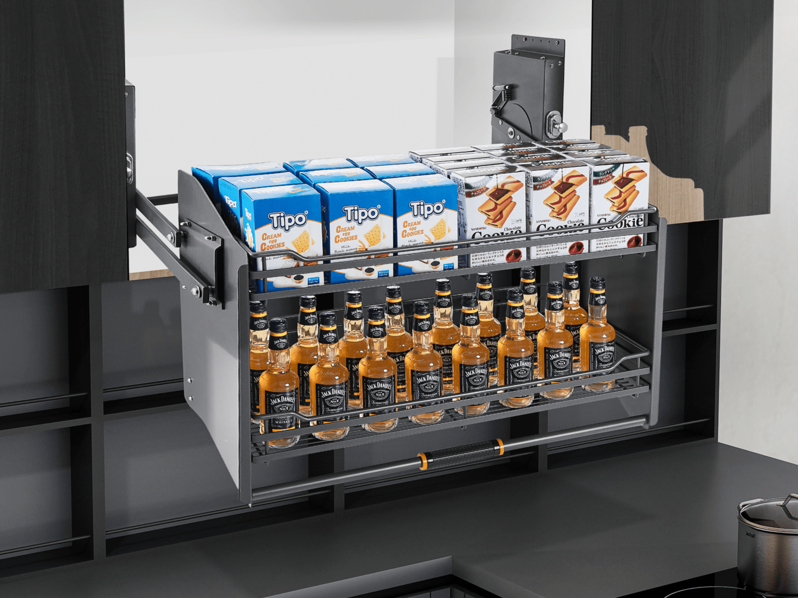 Floren Series Lifter Storage Basket – Modern lift-up storage basket in steel gray finish, available for 600–900 mm cabinets with smooth lifting motion, durable construction, and space-saving design.
