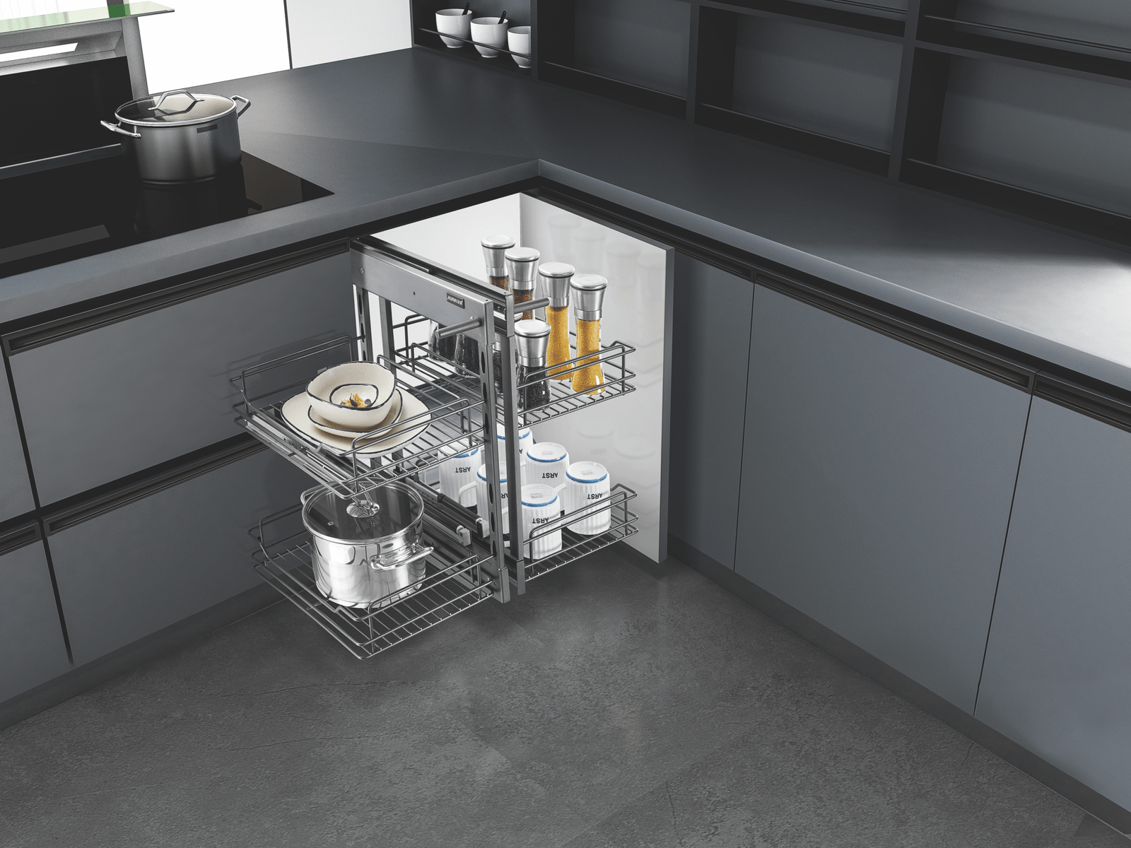 Floren Series Full Pull Out Magic Corner – Smart corner storage system with a full pull-out design, smooth sliding access, premium steel gray finish, and efficient use of hidden cabinet space.