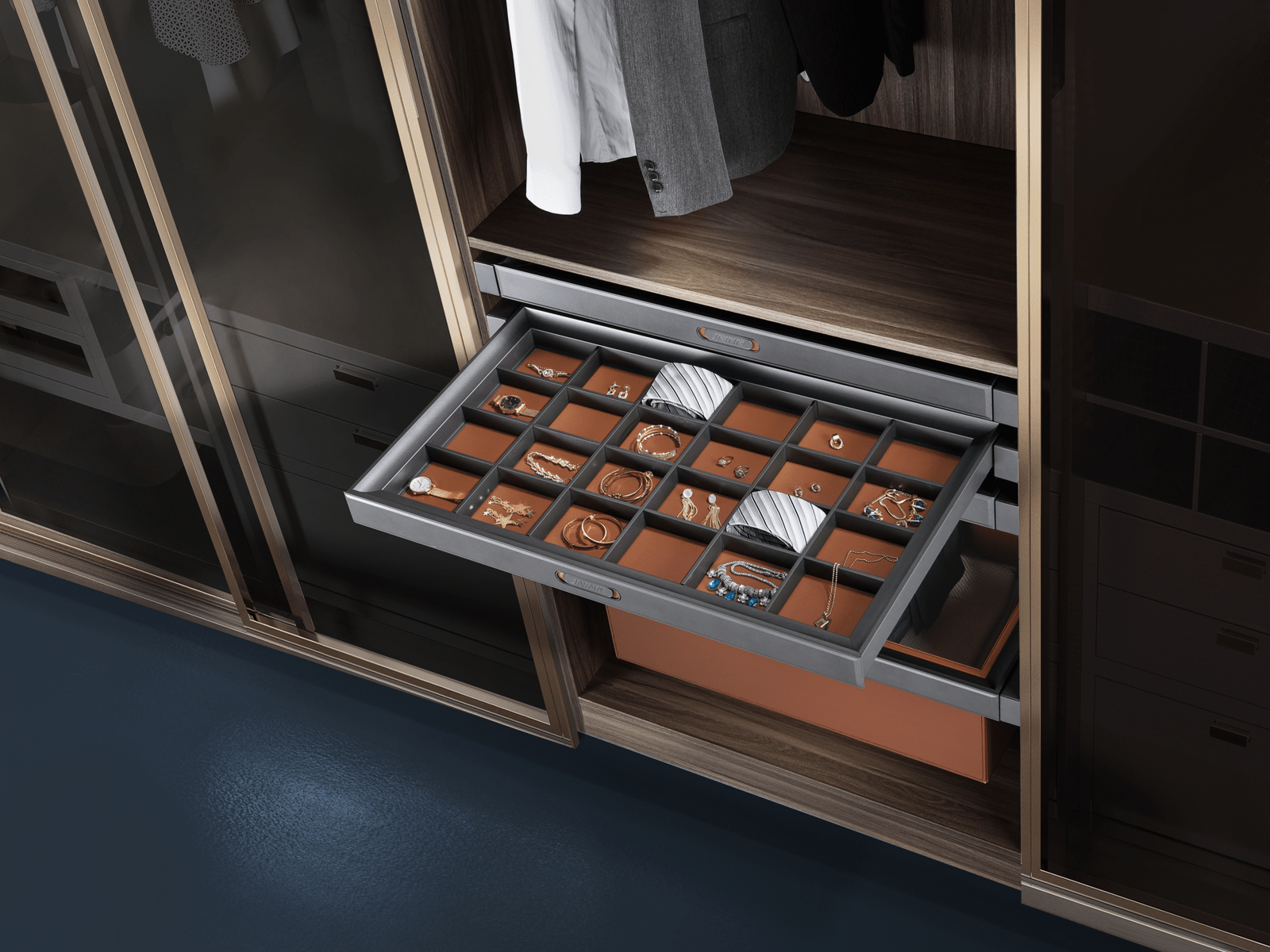 Muffy Series Treasure Box – Double-layer aluminum alloy jewelry box featuring orange ochre leather detailing and a scratch-resistant finish. Combines strength, elegance, and smart storage design, available in multiple sizes (564–964 mm cabinet widths) with a modern space grey look.
