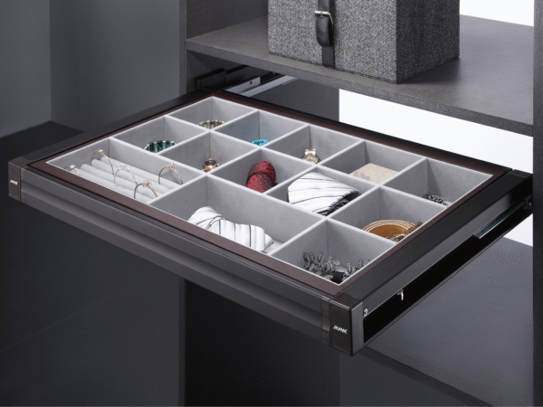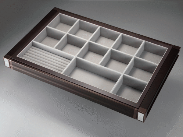 The Wisdom Beauty Series Jewelry Case is an exquisite fusion of artistry and functionality, designed to keep your precious accessories organized and beautifully displayed. Constructed with a high-purity aluminum alloy frame, it offers exceptional durability and a stable structure capable of supporting up to 35 kg. The 450 mm full-extension damping slides ensure smooth, quiet operation — tested for over 50,000 cycles for lasting reliability.