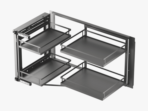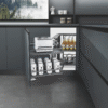 Crafted in a modern steel gray finish, the Corner Monster fits cabinet sizes 864–964 mm wide, offering durable construction and smooth pull-out functionality. Perfect for pots, pans, and frequently used items, it transforms underutilized corners into valuable storage areas.