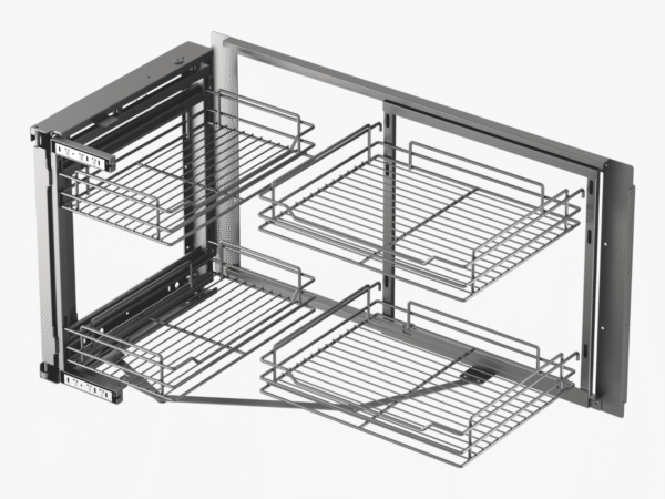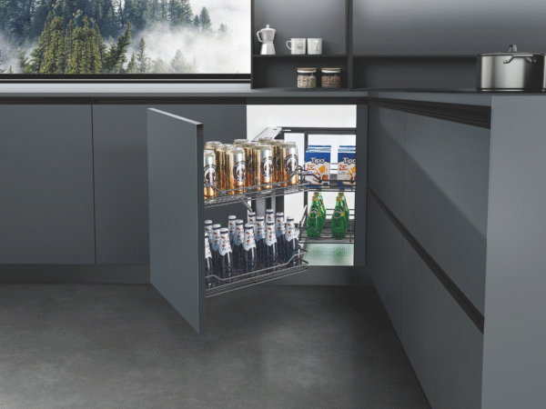Crafted with a durable steel gray finish, this corner basket system combines strength, functionality, and modern elegance. Its full-extension design ensures easy reach from all sides, making it ideal for storing pots, pans, or kitchen essentials while maintaining a seamless look.