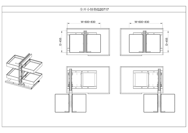 Measuring W660–830 x D455 x H592 mm, it fits perfectly into 900mm cabinets. Even with its compact size, the clever basket design maximizes your storage potential, providing plenty of room for dry goods, packaged foods, and kitchen tools.