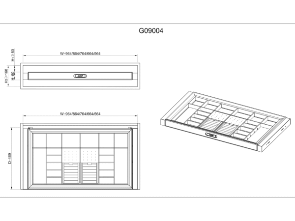 Multiple Sizes: Available for cabinet widths of 564–964 mm in a sleek space grey finish.