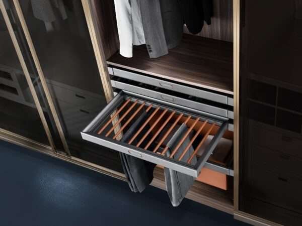 Modern Aesthetics: Minimalist form and space-grey finish enhance wardrobe style.